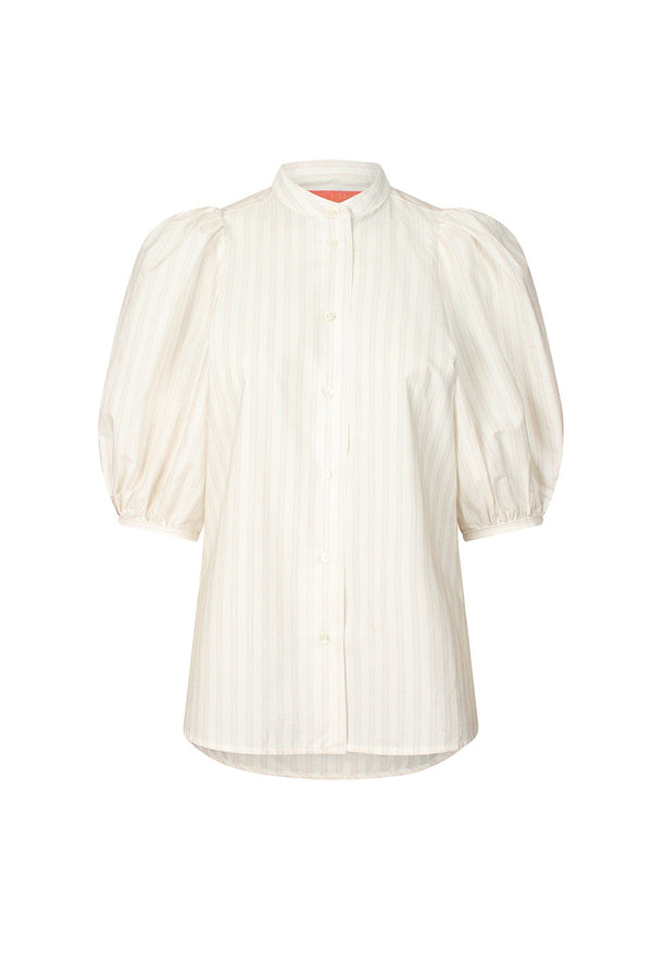 Skjorten er uden krave, og har de skønneste puf ærmer med længde ned til albuen.