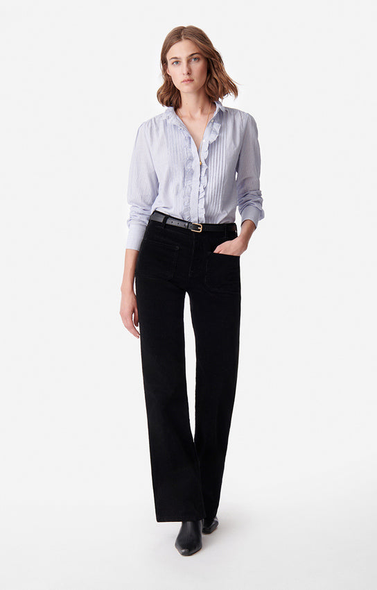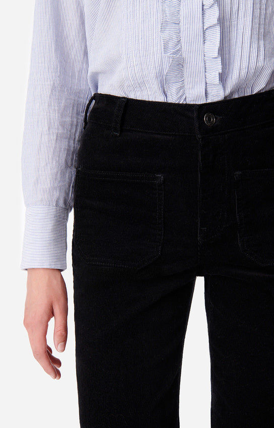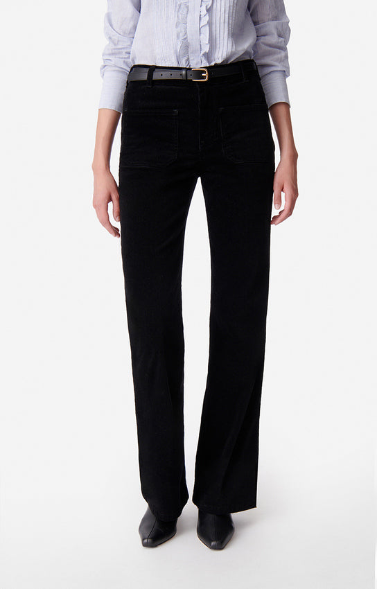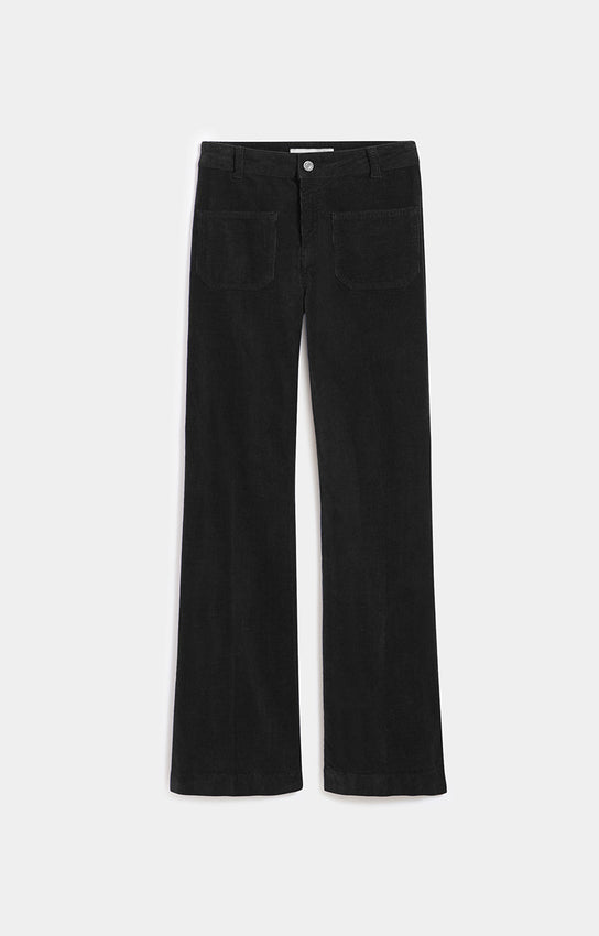 Bukserne er i fløjl, og har høj talje med påsatte lommer både for og bag.