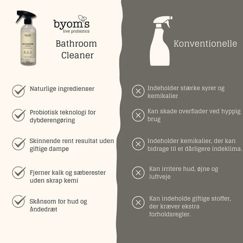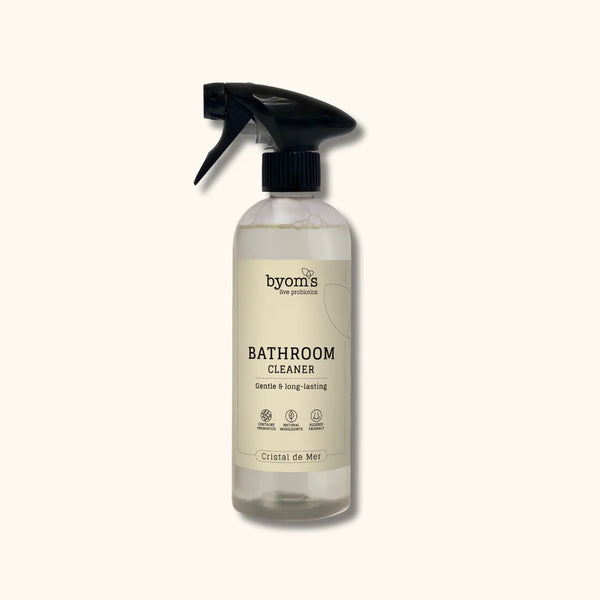 Byoms Bathroom Cleaner med probiotika giver effektiv rengøring af badeværelset uden skrappe kemikalier.