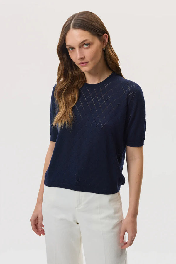 Merino wool pointelle round neck t-shirt - Navy fra Johnstons of Elgin.