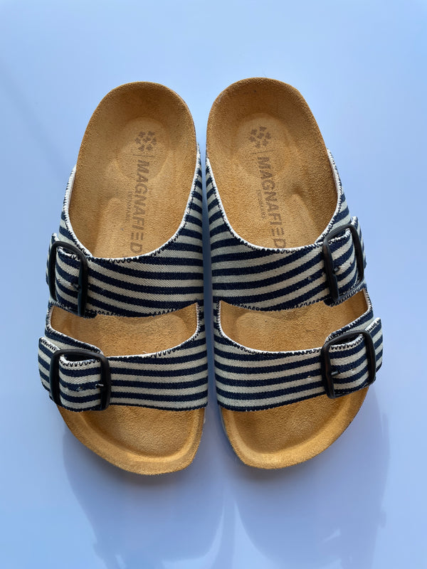 Thora Sandal 2-Buckle fra Magnafied i stribet japansk denim.