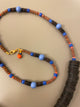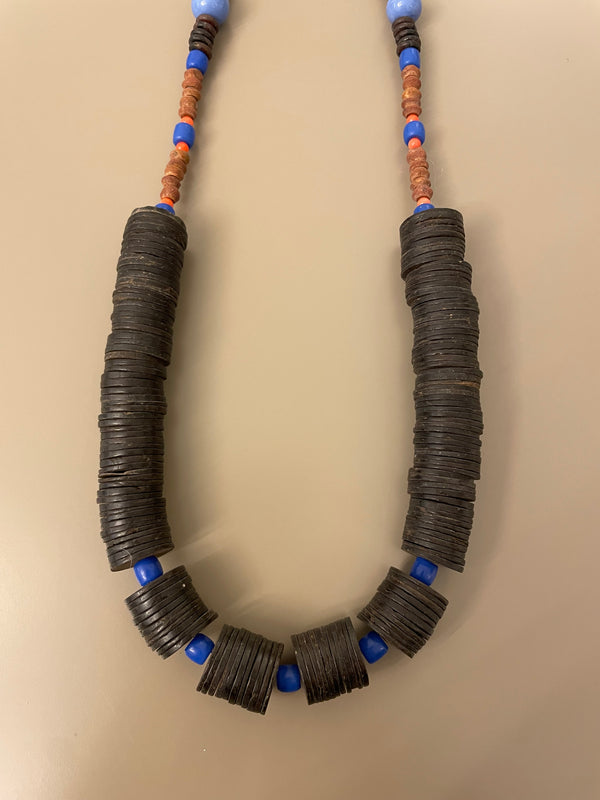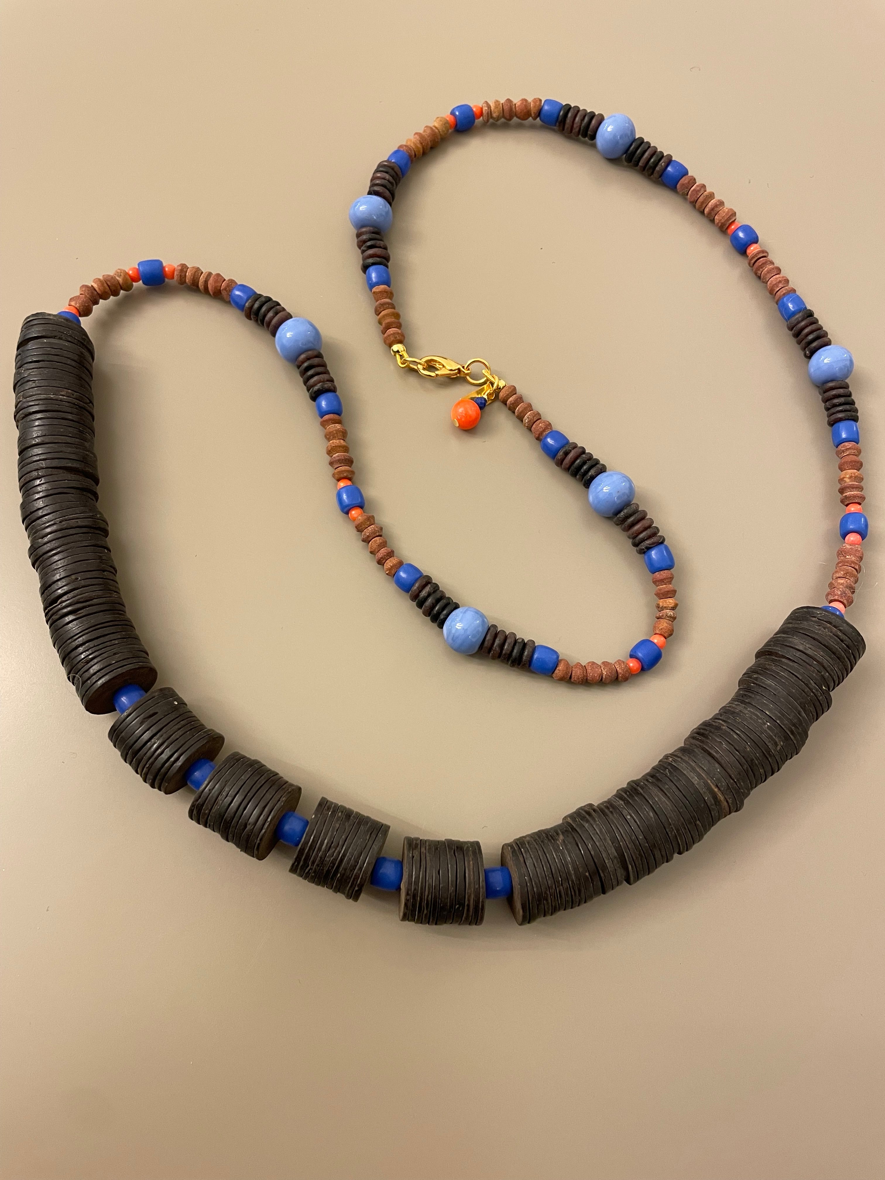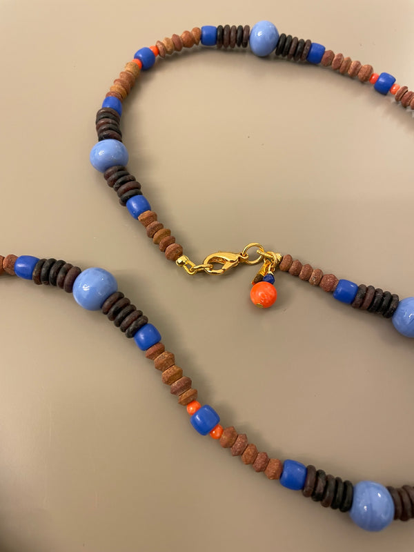 Limkilde halskæde 76 cm - flade mørkebrune perler + små blå