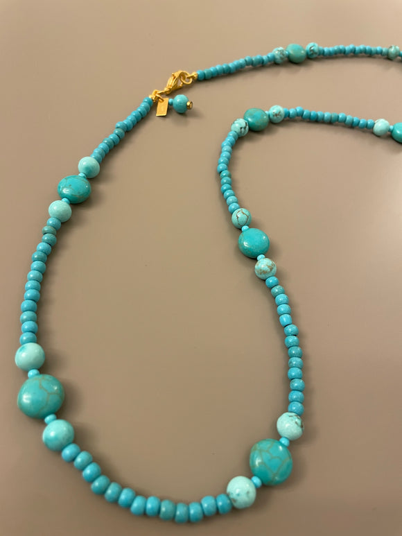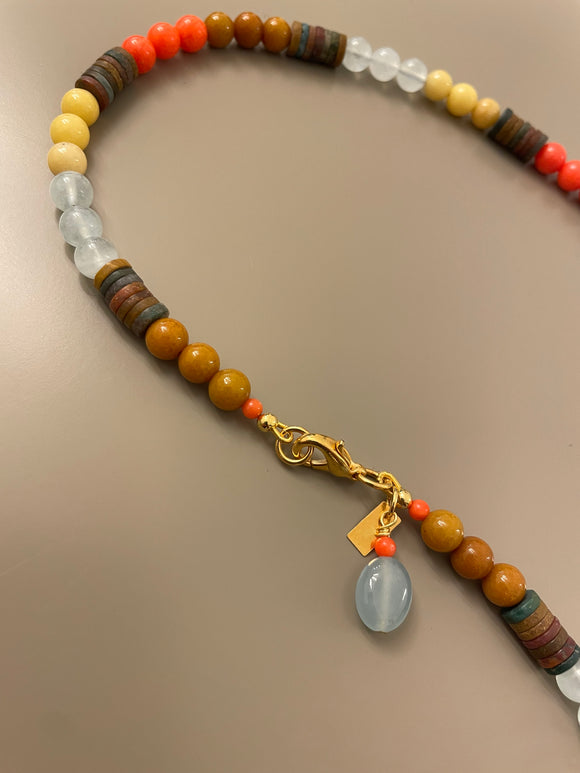 Limkilde halskæde 76 cm - Flade aqua farvede perler + små multi