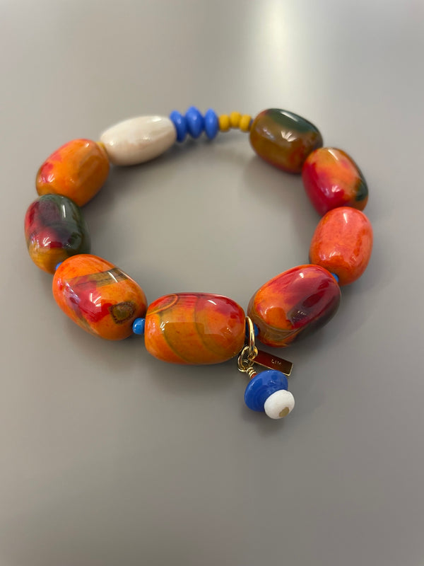 Limkilde armbånd - Store ovale perler i orange/rød/grøn + klar blå